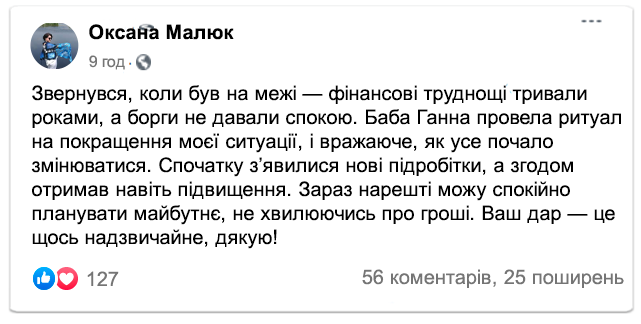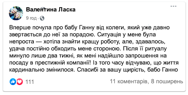 Зараз баба Ганна вже не може приймати всіх охочих особисто через вік і стан здоров'я. Тому вона продовжує допомагати людям онлайн, передаючи свої настанови та проводячи ритуали на удачу на відстані.
